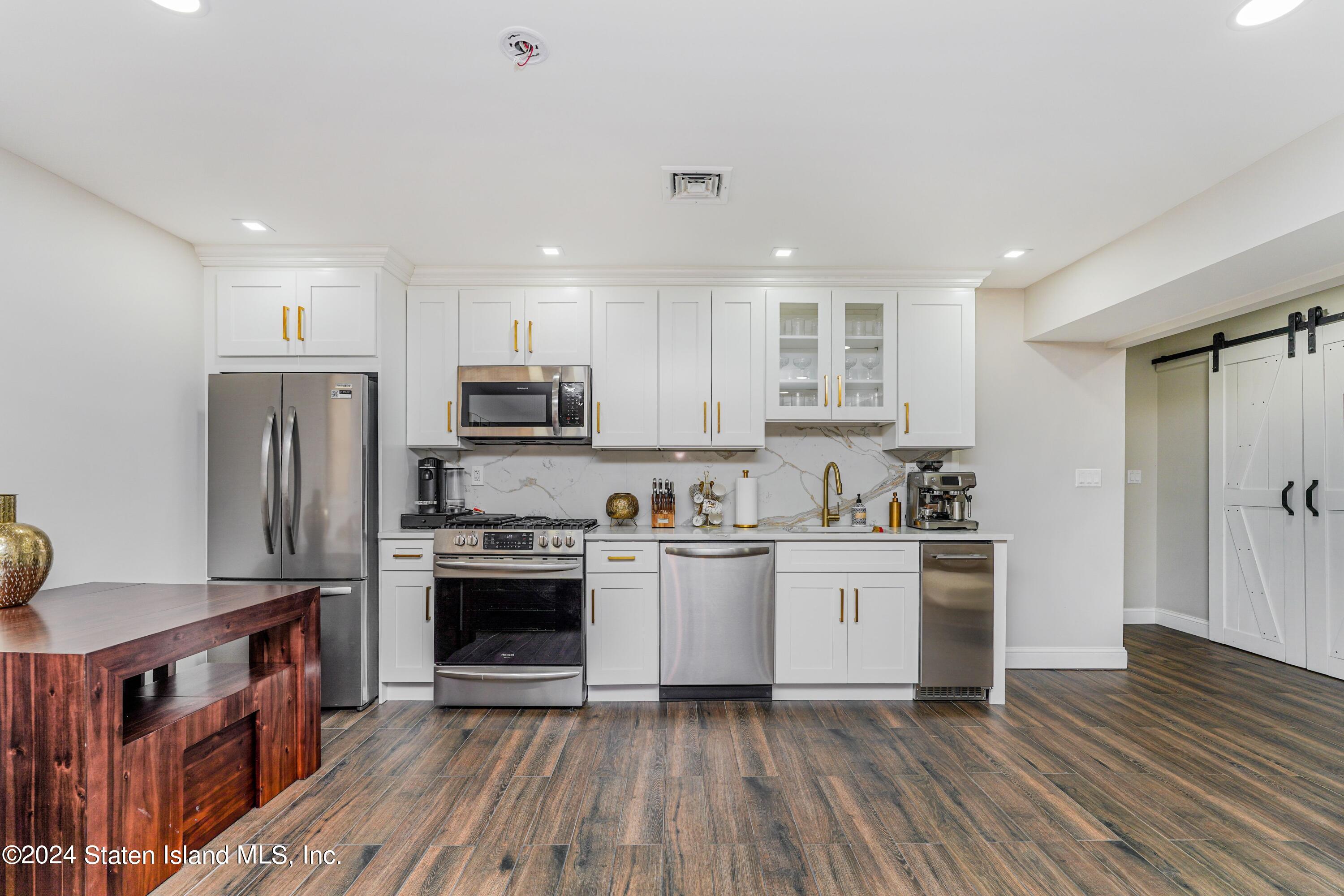 Additional brand new ground level kitchen with fridge, icemaker, and dishwasher.
